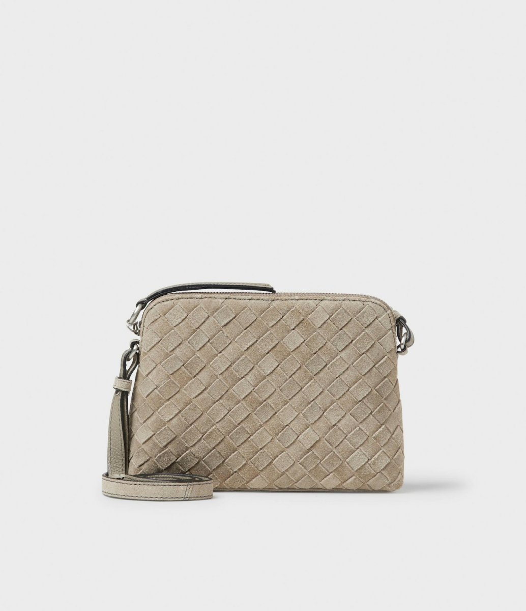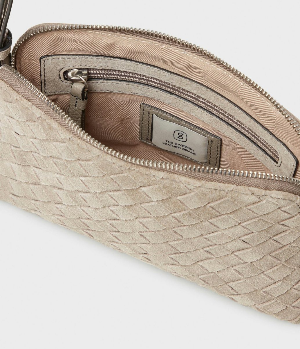 Tillverkad i flätat mockaläder på framsidan och slätt läder på baksidan. I koläder, certifierat av Leather Working Group. En öppen ficka och en ficka med dragkedja inuti. 100 % polyesterfoder. . Väskan försluts med metalldragkedja. Justerbar axelrem (mocka på utsidan och buffelläder på insidan) med en längd om 115–122 cm. Hårdvara i färgad metall. Präglad Saddler-logo på baksidan