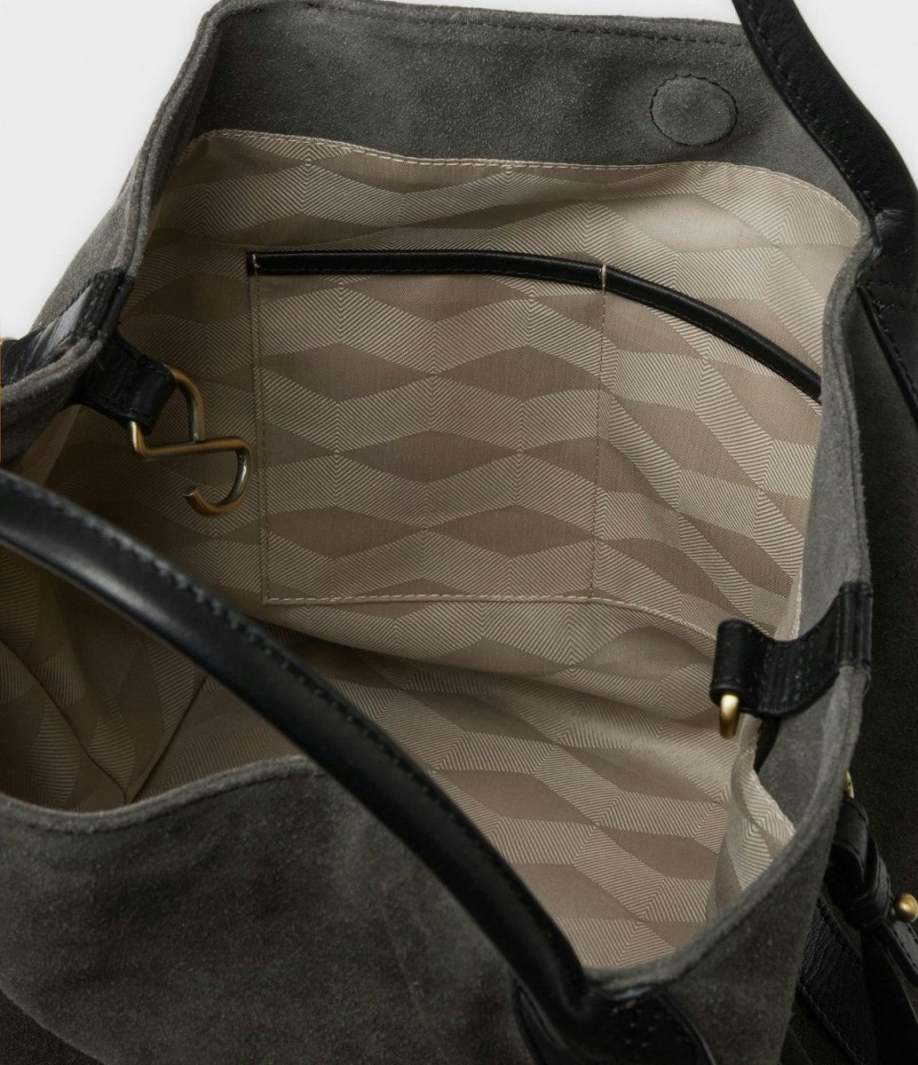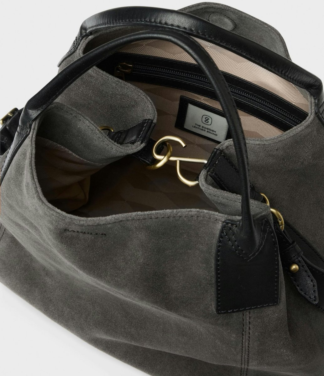 Produktbeskrivning:Toteväska Inés från Saddler. Smakfull toteväska i mjuk och följsam design, tillverkad i mocka av full grain-läder. Med ett rymligt huvudfack, två öppna fickor samt en ficka med dragkedja, finns det gott om plats för dina tillhörigheter. Väskan försluts med magnet och har en hake invändigt för att kunna justera väskans form. Bär väskan antingen med full vidd och förslut med magneten upptill, eller vik in sidorna och fäst dem i kabinhaken för en mindre och rundare siluett på väskan. Perfekt när du inte fyller upp den helt. Väskan har långa handtag i läder som bryter av fint mot mockan. Till väskan tillkommer en juster- och avtagbar axelrem i läder, med en längd om min. 99 cm och max. 120 cm. Detaljer i mässingfärgad metall. Präglad Saddler logo.